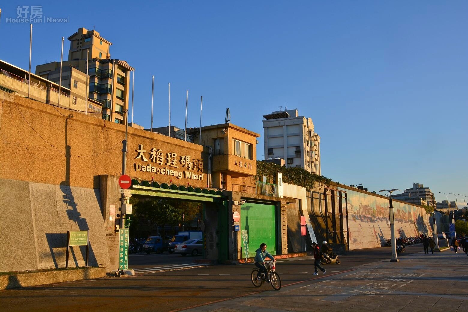 大稻埕碼頭已不再是貿易港口,單車客與散步的民眾取代了過去進出的貨物,但留有"大稻埕碼頭"五個大字的閘門,卻讓人彷彿看見昔日風華。(圖文/好房News記者 陳韋帆)