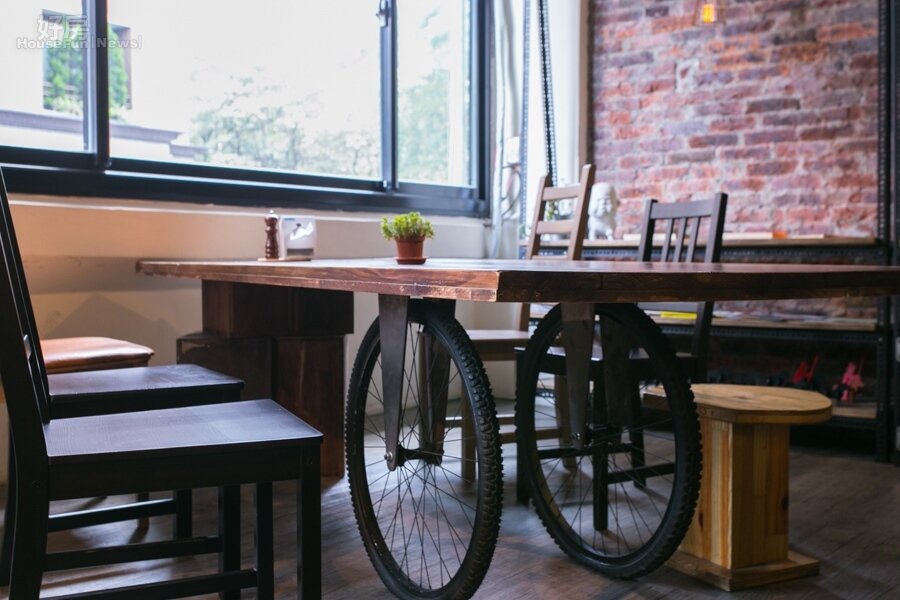 三輪車的輪子搖身一變成為餐桌的桌腳。襯印著後面牆上毫無修飾的紅磚牆,彷如讓人進入當年美軍在台時的風華年代。