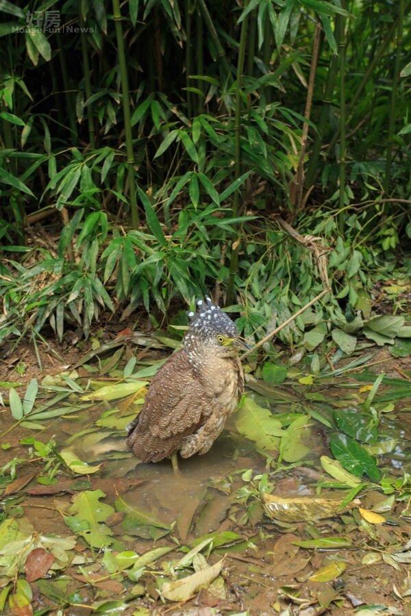 黑冠麻鷺在路旁的積水中洗澡,看到記者靠近也只有快步閃開而沒有飛起。