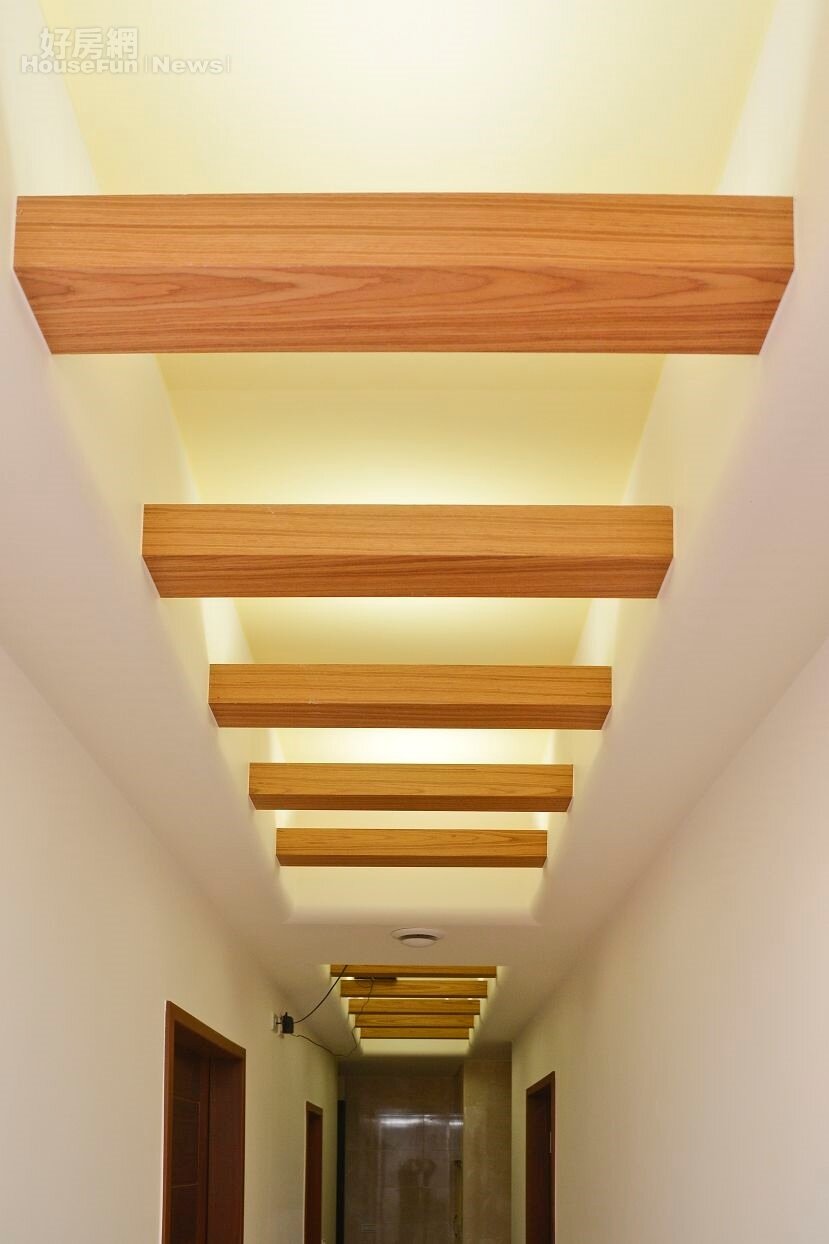 屋內長廊燈台用木材做裝飾,會讓燈光反射更有溫度