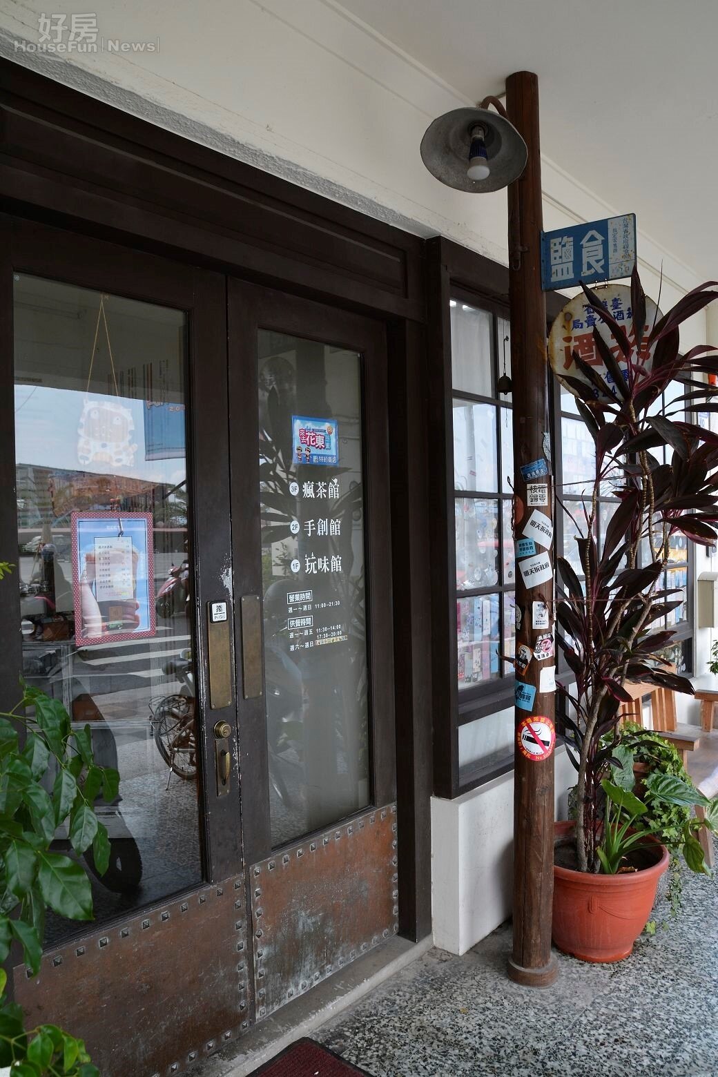 門口放著過去雜貨店常出現的菸酒販賣局的核照,以及食鹽販賣的招牌