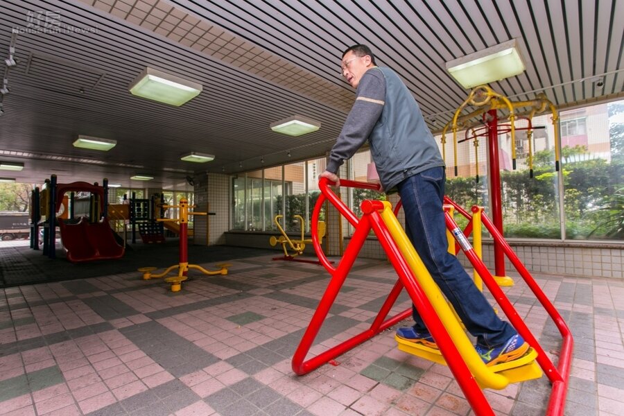小孩在兒童遊憩區嬉戲,大人也有簡易的健身器材可以使用。