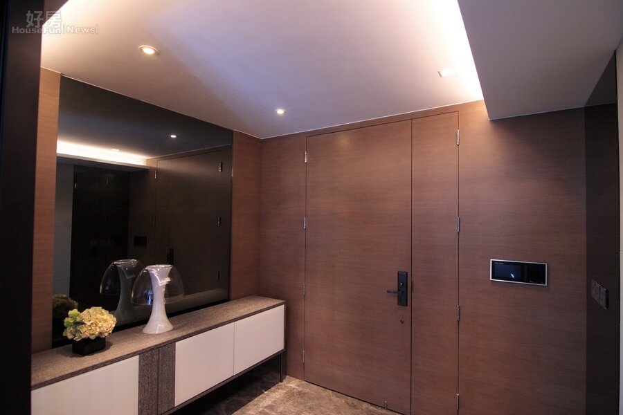 一樓玄關是進入整個居家中心第一印象的地方,利用鏡子的反射加大整體空間感。