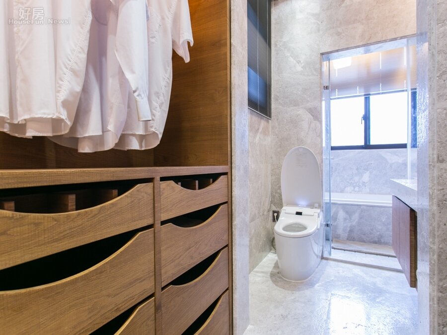 主臥室與主浴室以更衣間做區隔。不過要當心浴室濕氣會對衣服造成影響。最好的處理方式就是在更衣間與浴室之間多設一組門作為阻擋濕氣之用。