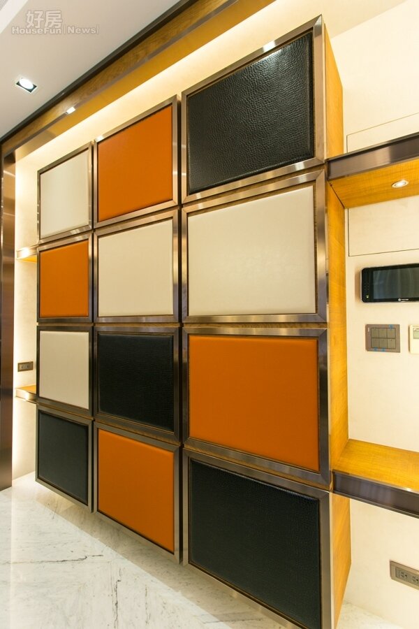 牆壁上的收納櫃揚棄傳統古板的原木色拘謹的設計,而是採用咖啡、黑與橘色的穿插設計,在內斂中透露出熱情。