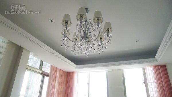挑高的客廳只放了一盞水晶吊燈。