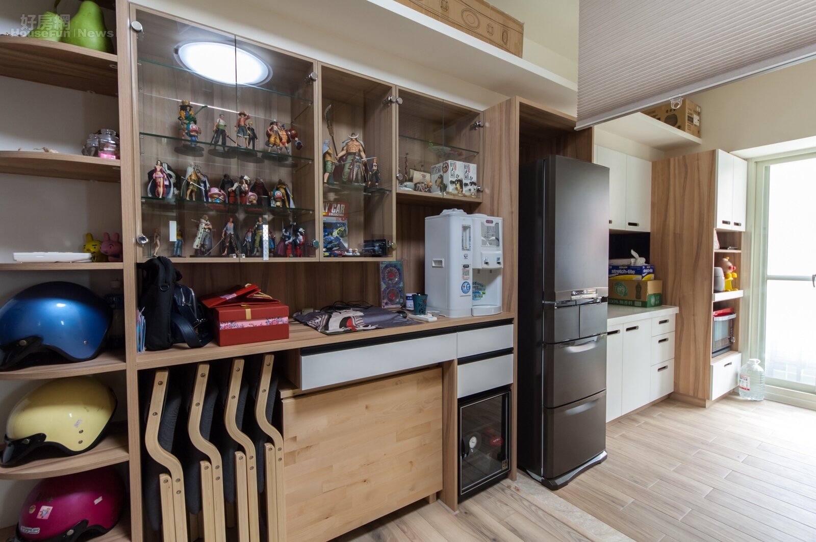 客廳另一側整面牆都是木作櫃,放著夫妻倆喜歡的動漫人物公仔,以及日本旅遊帶回來的紀念品。