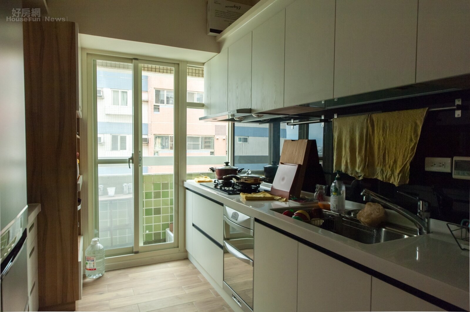廚房的樣子,雙口爐加上烘碗機、水波爐等基本設施,足夠料理烹調時使用。