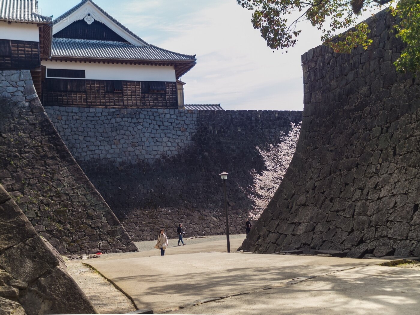 由觀光客當比例尺,就可看出石垣的高度有多巨大,圖中為「本丸御殿」