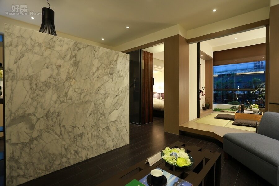 大理石花紋的客廳電視牆面,讓客廳更有質感,若是嫌客廳收納空間不夠的人,則可改為凹字、L型櫥櫃的設計。場地提供:內湖文心日日建案