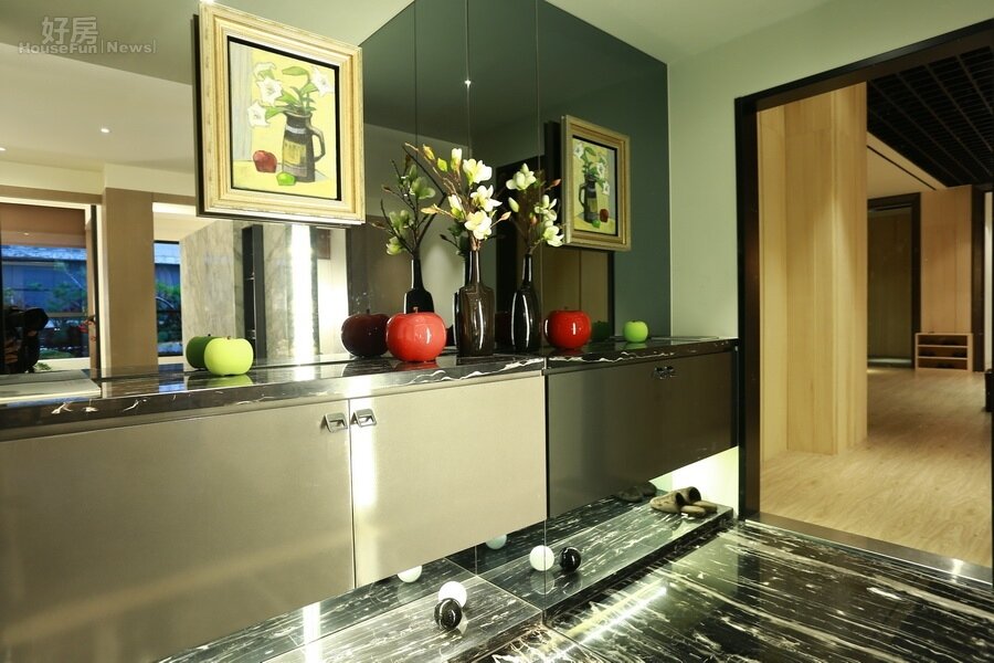 玄關裝上整面鏡子,可加大空間感。