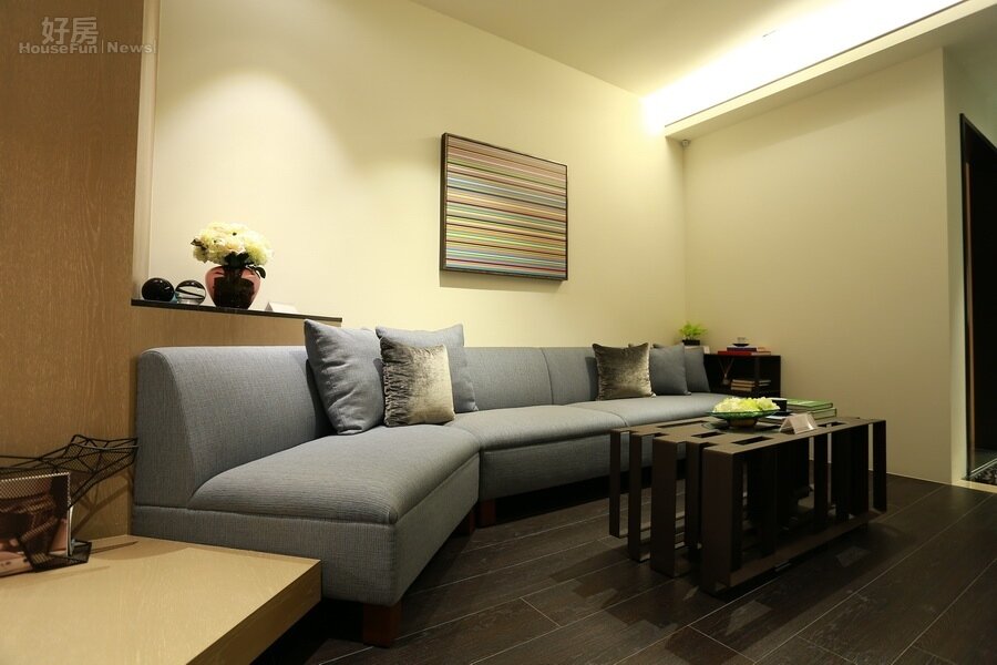 擺脫光棍!只要200萬,打造兩人甜蜜空間 三加二配置的沙發座椅不採L型排列,而是略為呈現弧形的方式,這是為了讓進屋之後的動線更為流暢。灰色的沙發搭配白色的牆面,整體來講就是一個極簡風。燈具部分也揚棄主燈的傳統概念,而是以嵌燈來當照明。 1454 上一張 下一張
