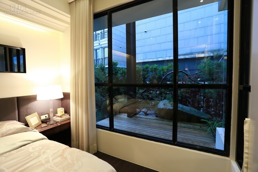 主臥房可採用大型落地窗以便採光,外面陽台再栽種一些綠色植物進行造景,就會有在城市中度假的氛圍。