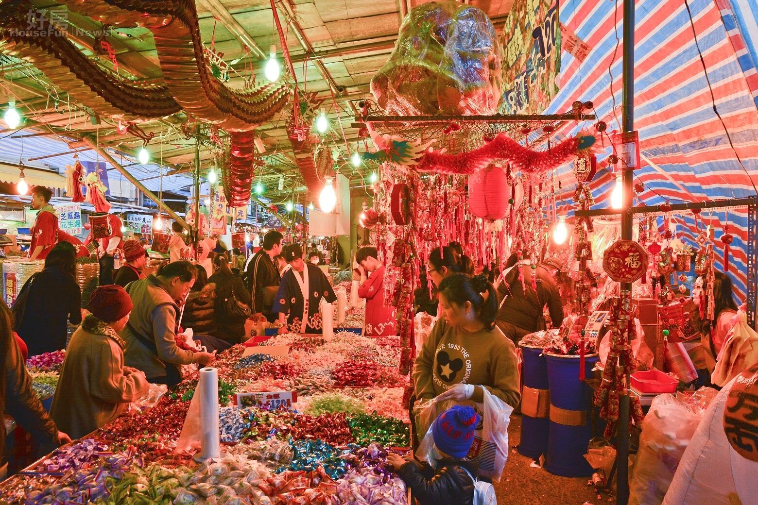 少了過去貿易盛景,添了十分喜氣;每到過年時,迪化街店家紛紛高掛燈籠,擺出一系列糖果、零食等食品,讓民眾方便選貨。(圖文/好房News記者 陳韋帆)