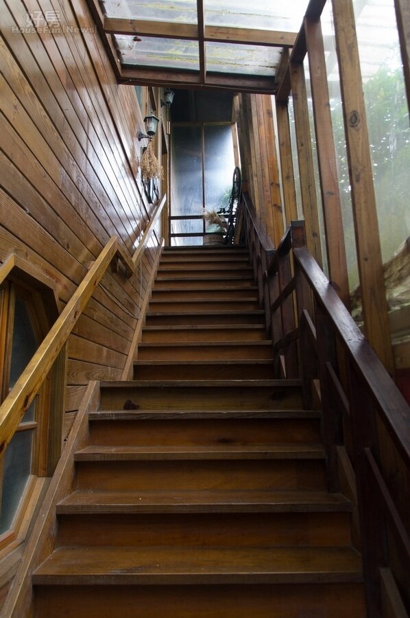 繞過三合院,拾級而上就可抵達石牆咖啡屋。為了迎合底下三合院的設計,整棟咖啡屋看不到水泥鋼筋,而是以木造為主。