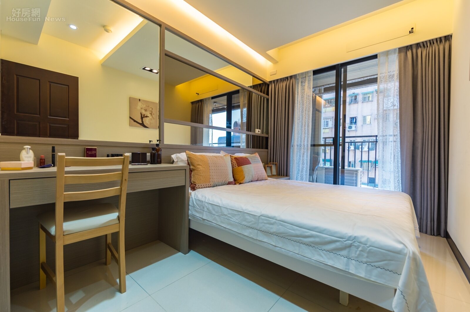 70萬打造舒適小宅 因為實際可使用的面積不大,因此主臥室內僅有一張現場木作的梳妝台,以及一張雙人床,因為有單面採光,在白天時光線還算可以,但是為了補強室內明亮感,設計師在床頭以及梳妝台的牆上貼上了大面積的鏡子,一方面可讓室內空間有加大感,另外一方面也可讓屋外引進的光線透過鏡子反射增加室內空間的明亮度。這樣的裝潢雖然看起來不錯,但晚上起床光線不明顯的時候,大面積鏡會讓人有種不舒服的感覺,這點要特別注意。 1419 上一張 下一張