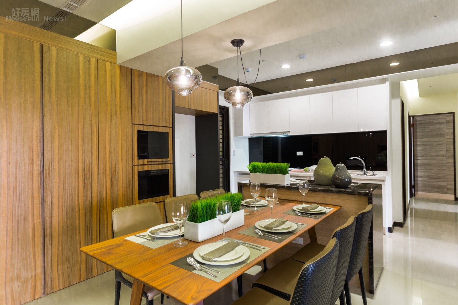 開放式餐廳與廚房一景。在靠近後陽台的牆面設計師利用空間多增一組大型收納櫃。