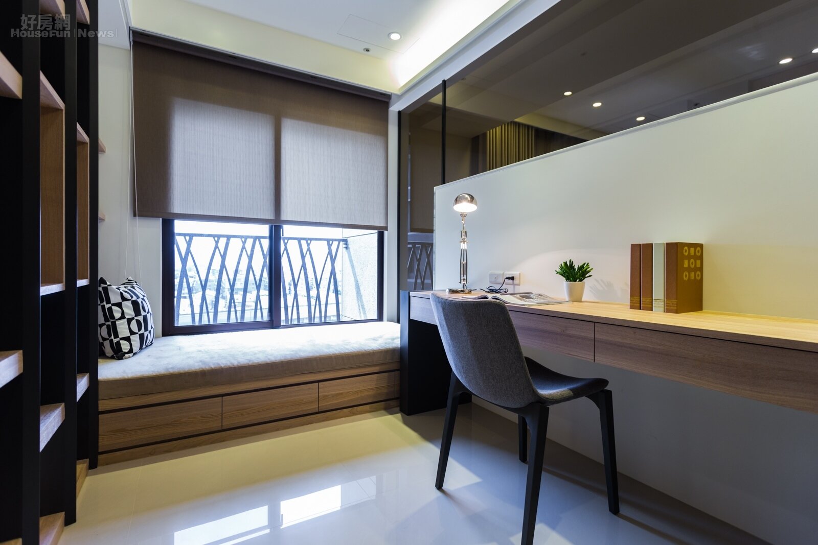 裝潢享受舒適高貴不貴,一坪三萬八就辦得到 書房設計上既有獨立感,又不失與外界相通的設計。靠近窗戶邊還有一組小型沙發床,可當作閱讀區也可作為小憩之用。背後的書架隔層使用黑與棕雙色設計,放書或放收藏品都很實用。 2745 上一張 下一張