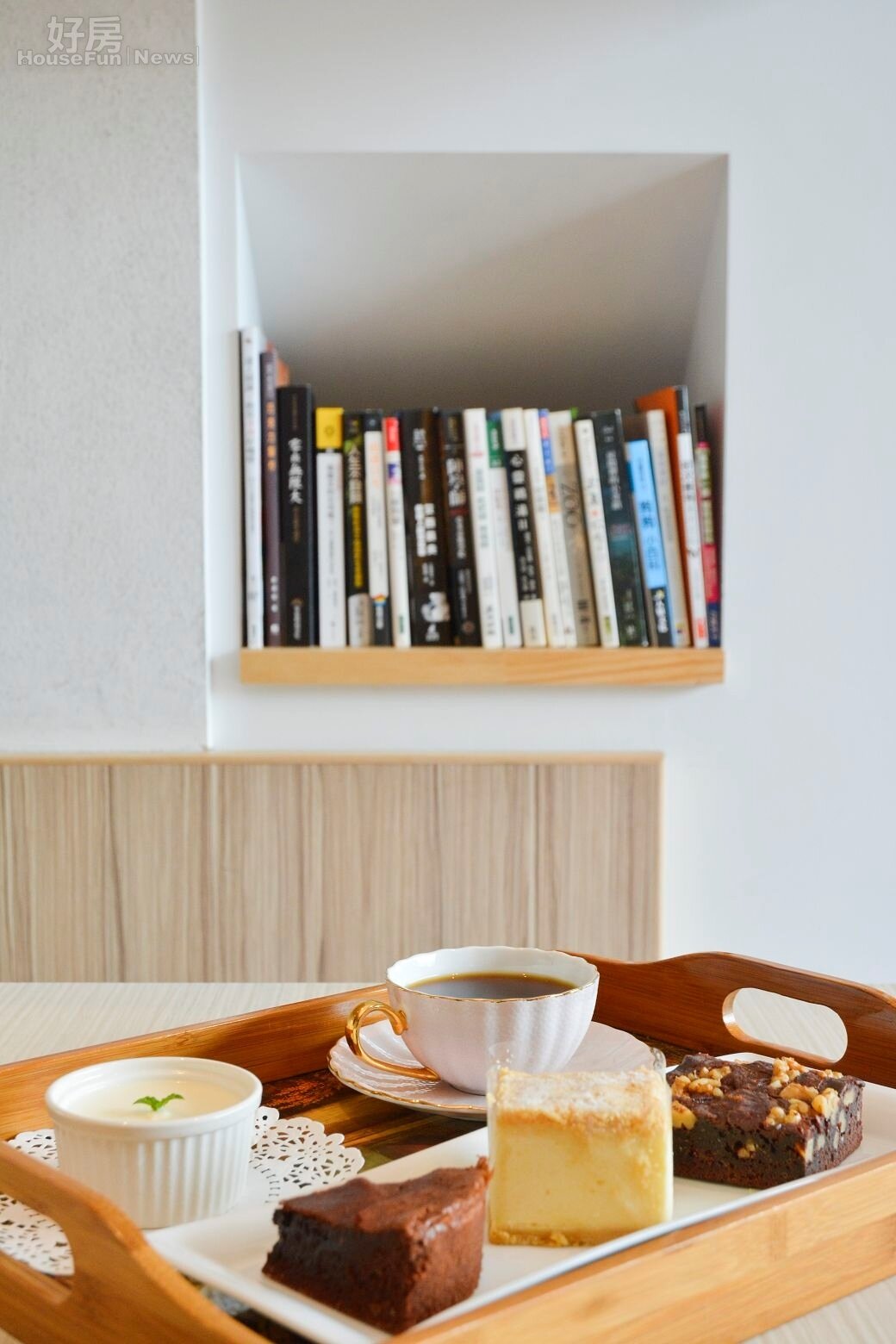 閣樓下的空間不僅做餐桌利用,並在中間挖洞製成書櫃,讓人同時沉浸在書香與美味之中,令人流連忘返。