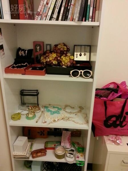 一旁的收納櫃擺放著項鍊飾品與書籍。