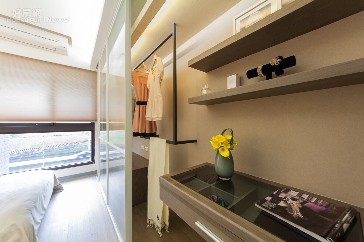 主臥室的衣櫥為現場木作所作成,搭配黑色方形鋼管當作掛架使用,拉門部分則是彩透明玻璃,目的是盡量增加室內空間感。