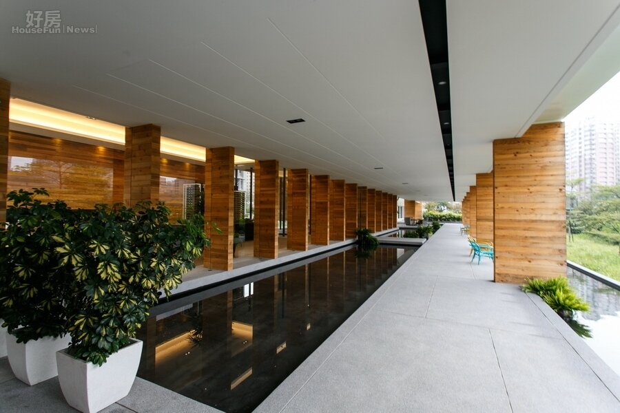 位於淡海新市鎮的建案「川普寬庭」,走的是與自然結合的風貌。因此在接待中心的設計上,特別加透光長廊,讓看屋族走在這邊如同走在度假中心一樣舒適。