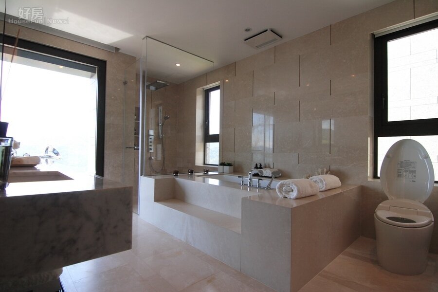 居高臨下,沒有人可以看到隱私的部份。因此在浴室設計上採大面窗戶引入陽光,邊洗澡邊賞景,人生悠閒莫過於此。