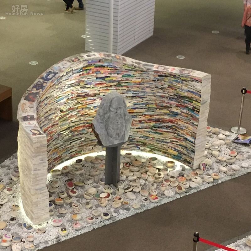 總圖四樓以書砌成的公共藝術作品,這尊為義大利文藝復興時期的一個博學者,也是發明家,達文西。