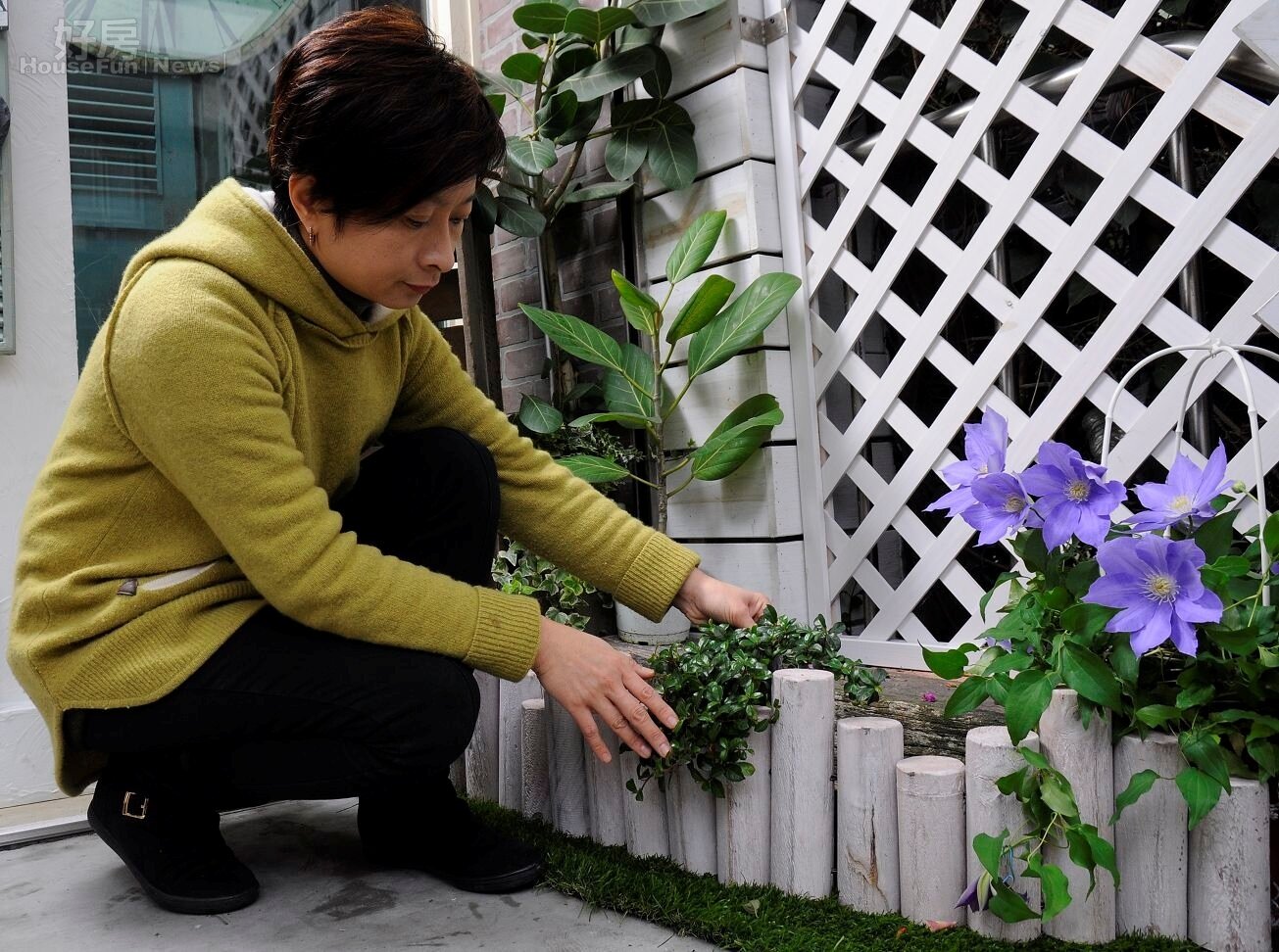 將小型盆栽放置在人工草皮上,並製造出高低錯落的層次。盆栽尺寸以5~7吋最為適合,開花植物與觀葉植物交錯擺放較佳。(好房News記者 陳韋帆/攝影)