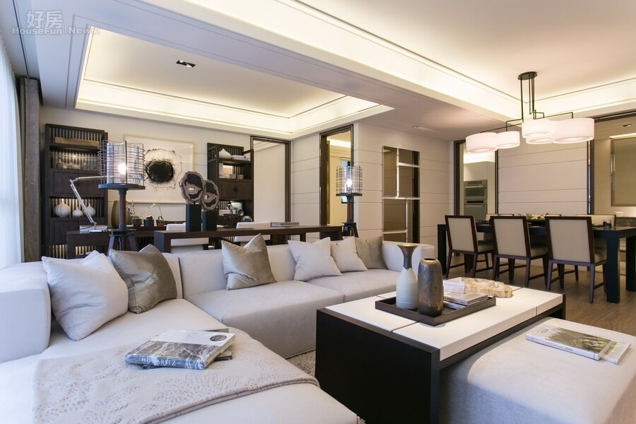 犧牲原本單一房間的書房,牆壁打掉後與客廳、餐廳連結在一起,營造出大器的空間感。