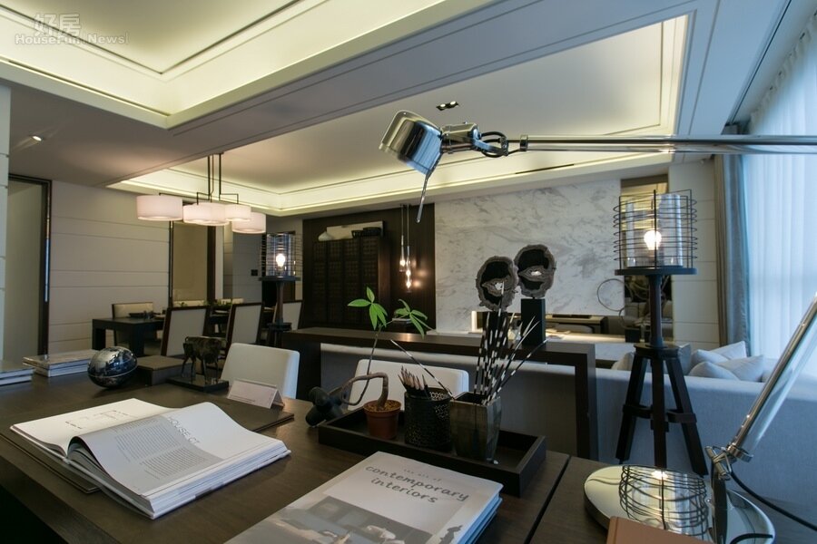 木頭材質黑深色的書桌,可營造出主人內涵氛圍。若是想客廳更為活潑,不妨改用淺色調家具與客廳連成一線。