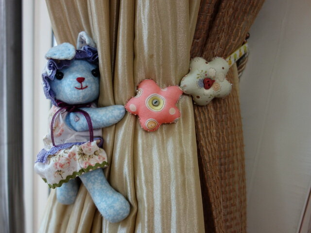 工作室的牆面以大木櫃展示各類布包包,還有放上拼布作品當掛畫,令人忍不住大叫卡哇依。一樓通往二樓的樓梯也充滿驚喜,彭麗錦以大面積的節慶圖案掛布來裝飾牆面,階梯上則是大型拼布娃娃和布作聖誕樹,十分可愛。就連窗簾上的綁帶,都是手作的拼布兔子娃娃,相當具有巧思!
