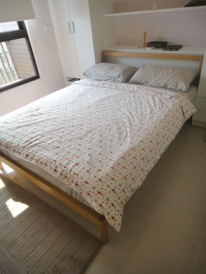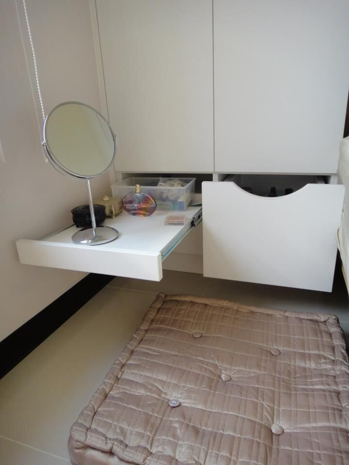 而主臥則是Iris花最多心思設計的地方。「因為才三坪,要放床、衣櫥和化妝台,設計師覺得是不可能的任務。」最後因同屬七年級生,想法容易溝通,一起想出了絕妙方法,就是設計一個內嵌伸縮桌面在衣櫃下方當化妝桌,桌面下再設計一個抽屜置放保養品,而且靠窗採光很好,讓喜歡坐在地上化妝的Iris超滿意的。等於原本是一個衣櫃的高度變成衣櫃和化妝桌的連體櫃,只是化妝桌的高度要坐在地上才行。