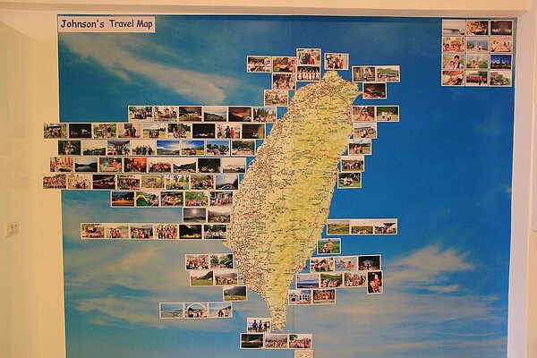 Johnson和Peggy一家四口,露營資歷雖然才三年,但已經去過上百個營區露營過,因此客廳的一面牆還特別設計了「露營地圖」,上頭擺滿露營照片,記錄著這個「移動的家」旅行的點點滴滴。「本來只是一個畫框,用照片記錄去露營過的地點,但去過的地方愈來愈多,乾脆就用大型輸出帆布,做成一個露營地圖,反而很有紀念性。」