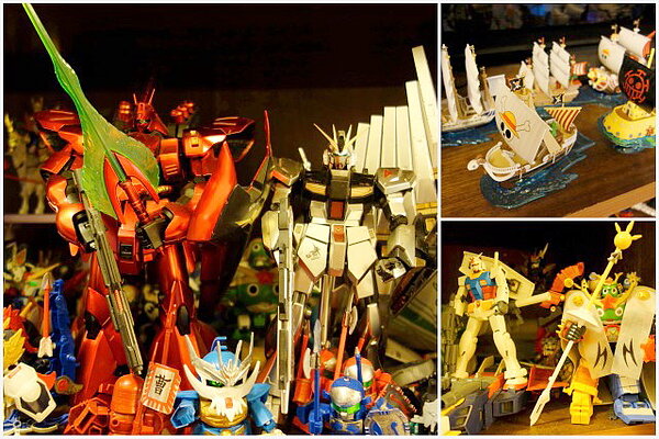 走進二樓的主臥室,就可看到左邊的大櫃子裡滿滿都是大大小小、各式各樣的模型玩具,旁邊的電視櫃裡也有好多艘航海王的船模型,下方更多各色各樣的鋼彈。
