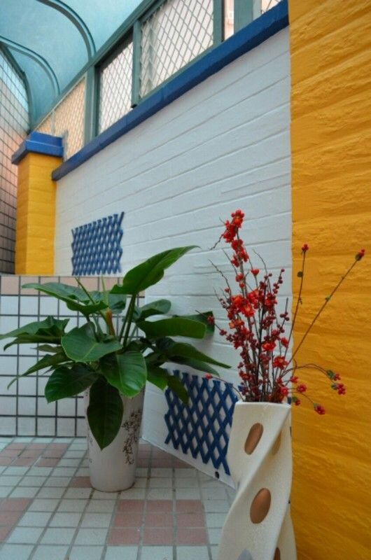 一樓的客廳沙發牆以亮眼的鮮黃色襯托黑色沙發,隔壁的大樑柱則以文化石貼壁,看起來相當霸氣。開放式廚房和客廳之間以淡色的羅馬簾做隔間,「朋友來時放下來,客廳就是主要的接待區。」工作陽台和花園則以藍和白為主的地中海色調,調和出陽光的味道。