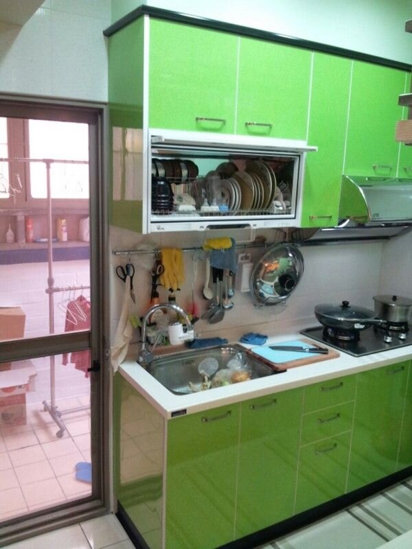 ←一字型廚房照風水師的建議,採鮮綠色,十分活潑