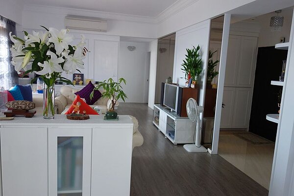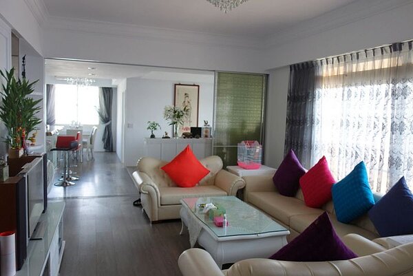 這間屋齡10多年的中古屋,原本是規劃成一間間的雅房供學生租屋,Vaness打通重新規劃,一進門就是氣派的玄關、大客廳,以客廳為中心點,右邊是大主臥和客房,左邊依次是開放式書房、兒子房、開放式餐廳、衛浴、女兒房、廚房和工作陽台。好客的她最喜歡和朋友坐在廚房的大木桌吧台上喝茶聊天,家裡兩隻小鸚鵡也會恪盡主人之責,飛來跟客人打招呼呢!