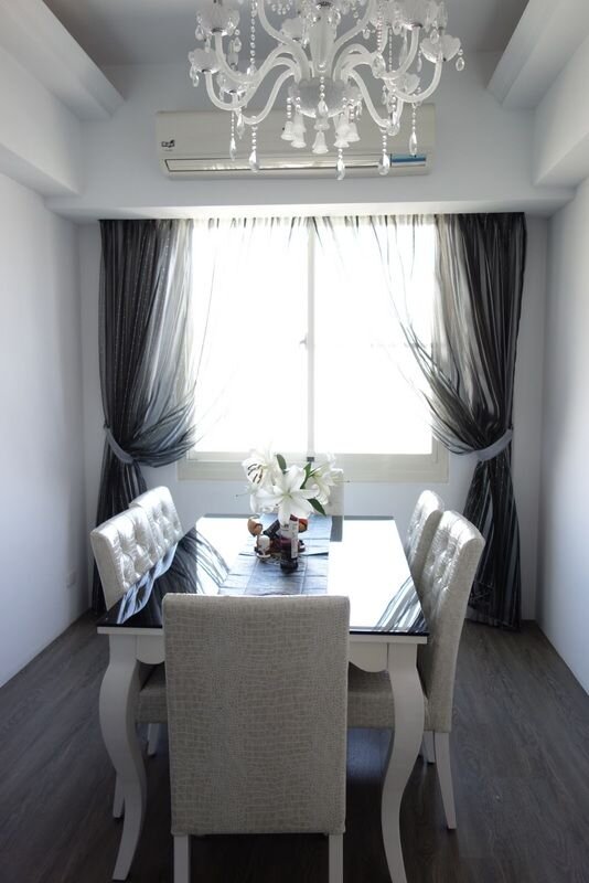 ←長形水晶燈搭配黑白餐桌椅和黑色窗簾的餐廳,像極了高級餐廳