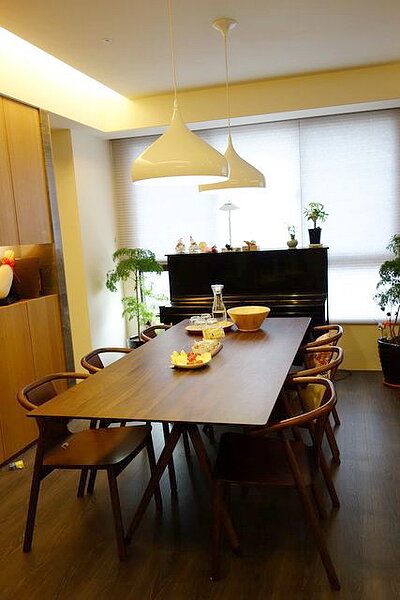廚房入口處的整面牆也是大面鏡子,讓一字型廚房感覺放大許多。餐廳和小孩書房的共同牆面也是一整面鏡子,使得原本就大的六人座餐廳顯得更寬闊了。