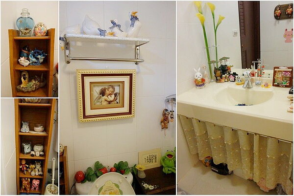 除了客廳,餐廳也佈置了許多小玩意,有Hello Kitty木作娃娃、Disney七彩小仙子、皮卡丘公仔,都是日本學生送的。廁所也充滿驚喜,洗手檯上有許多可愛的小東西,馬桶後方放置了優雅的歐風畫,毛巾架上還有小鵝瓷器,兩旁也利用空間放置了小木櫃,裡面擺放了各式的陶藝品,看得出Amy巧手佈置的用心。