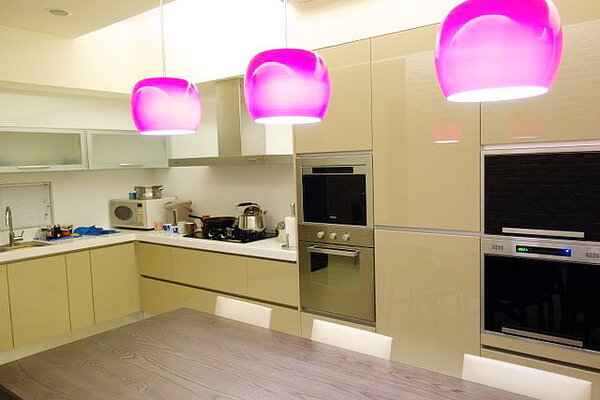 多年窩在小廚房做菜的Penny,也為自己打造了夢想中的大廚房,使用面積幾乎和客廳一樣大,香檳色的L型流理台和烤箱、蒸爐等電器嵌入的櫥櫃,整體感十足又很時尚。最有特色的是一款名媛孫芸芸代言的冰箱和三個餐桌吊燈都是櫻桃色,看起來非常可口。「關燈時像三顆櫻桃,開燈時像紅蘋果,讓人想吃一口。」