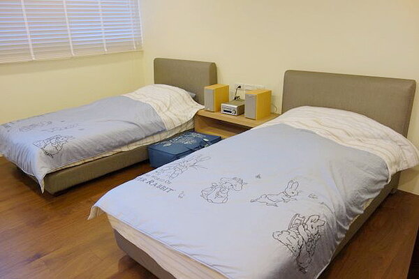 ↓室內佈置走自然風的大地色系,牆面、窗簾和床單傢飾選用灰藍和淡黃色