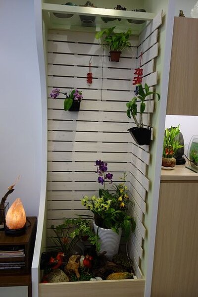 喜愛園藝的太太以白、綠作為室內佈置的主色調。雖然沒有陽台,還是在玄關進來客廳的角落,設計了一整面很有特色的小花園。「家裡的魚缸、花園,都是麻雀雖小、五臟俱全,增添許多生活樂趣。」由於夫妻倆都是虔誠的佛教徒,所以第三間房間規劃為佛堂和太太的畫室。