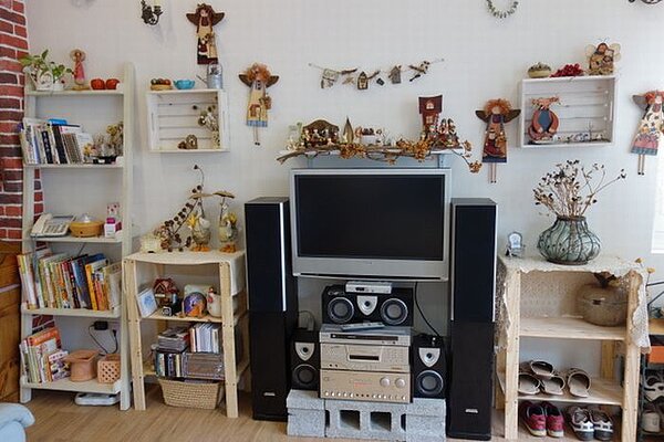 ↓客廳電視櫃在眾多繽紛可愛的裝飾品下,顯然只是配角