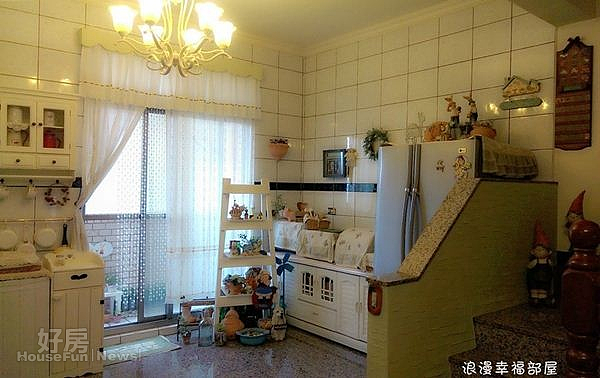 ↓廚房以白色鄉村風為主調,以布飾、珠簾和蕾絲增添浪漫