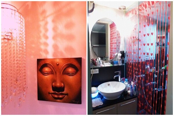 ↓招桃花的水晶燈(左),以及浴室旁自己做的心型線簾(右)