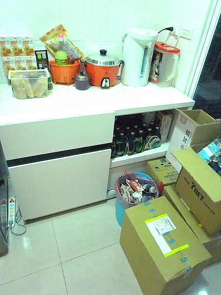 ↓阿Ben愛吃零食,收納櫃裡隨時都塞滿食物,還特地用紙箱裝好