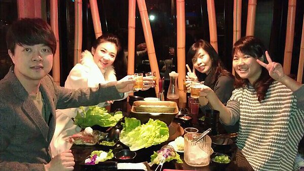 ↓黃思婷(左起)開火鍋店,同門藝人翁立友、李明洋也特別來捧場