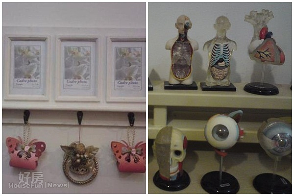 ↓從小蒐藏的吊飾,現在成了特色裝飾品(左);蒐集人體器官模型也是她的一大興趣(右)